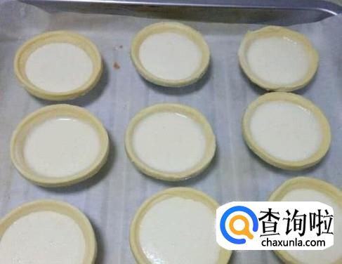 将过滤好的牛奶蛋液倒入蛋挞皮中,蛋液要离蛋挞皮边缘一段距离,因为蛋液受热会膨胀。