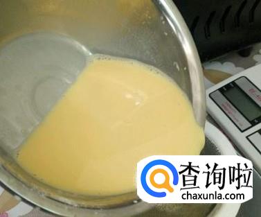 准备一个小筛子,将搅拌好的牛奶蛋液用小筛子过滤,滤出细细的牛奶蛋液,烤的时候,蛋挞心才细腻。