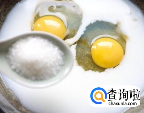 将适量的鸡蛋、牛奶、白糖放在小盆中。