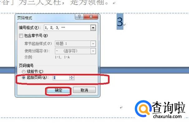 不过我们发现此时页码不是从“1”开始编号的,需要修改一下,选中页码后,点击“页码”“设置页码格式”,然后选择“起始页码”为1,点击确定。