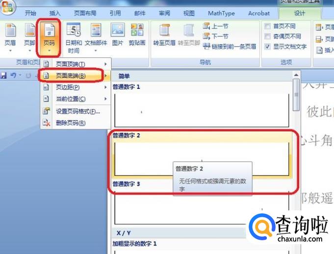 此时,点击工具栏“页码”,选择“页面底端”,选页码格式插入即可。