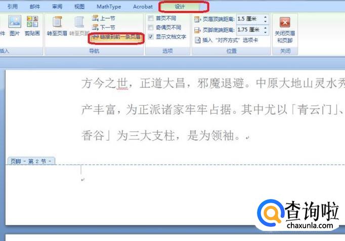 双击第三页页脚区域,进入编辑状态,如图所示,工具栏自动转到“设计”标签下,点击“链接到前一条页眉”,点击一下即可。