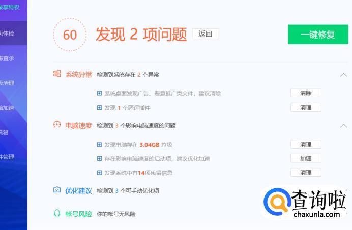 体检之后发现问题,然后点击右边的“一键修复”。