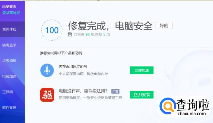打开电脑管家,进行全面体检。
