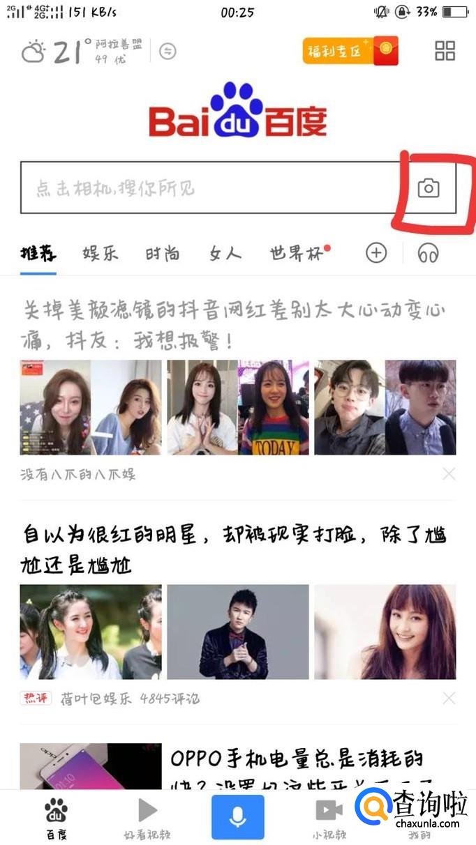 进入手机百度过后,点击百度搜索框旁边的拍照符号,进入拍照功能。