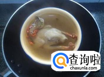 锅里面烧水,然后找一个盆放进锅里面,把之前准备好的鸽子和生姜片放进去,加适当的水。