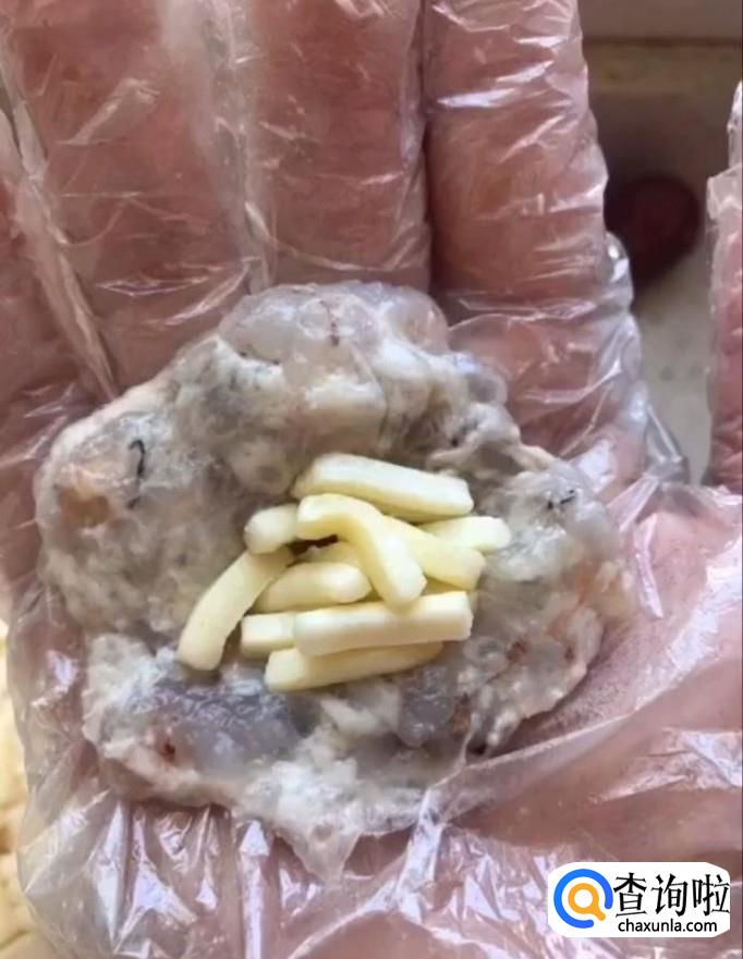 接着我们取一小部分用手按成小饼,里面包上适量的芝士