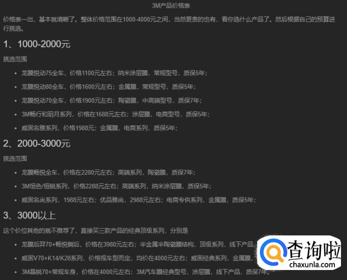 最后再来看以下3M汽车膜的价格表,其实3M汽车膜的价位属于中等价位,在贴汽车膜的时候,根据车子的档次再看需要配备什么价位的汽车膜。