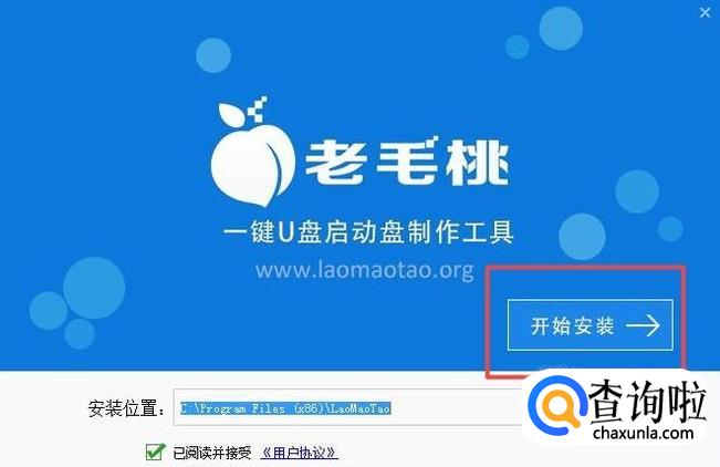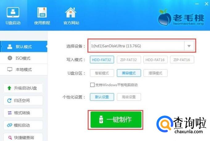 打开老毛桃u盘启动盘制作工具后,将u盘插入电脑usb接口,程序会自动扫描,我们只需在下拉列表中选择用于制作的u盘,然后点击“一键制作”按钮即可,如下图所示: