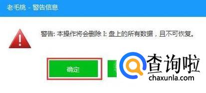 此时会弹出一个警告框,提示“警告:本操作将会删除 I:盘上的所有数据,且不可恢复”。在确认已经将重要数据做好备份的情况下,我们点击“确定”,如下图所示: