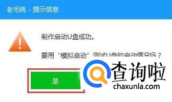 U盘启动盘制作完成后,会弹出一个窗口,提示制作启动U盘成功。要用“模拟启动”测试U盘的启动情况吗?我们点击“是”,如下图所示:
