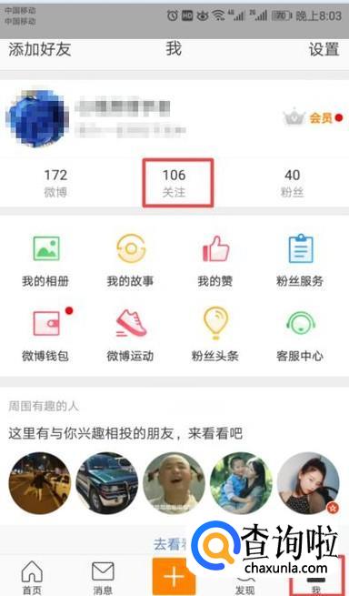首先,我们打开我们的新浪微博,然后我们点击右下角的我,然后我们点击关注;