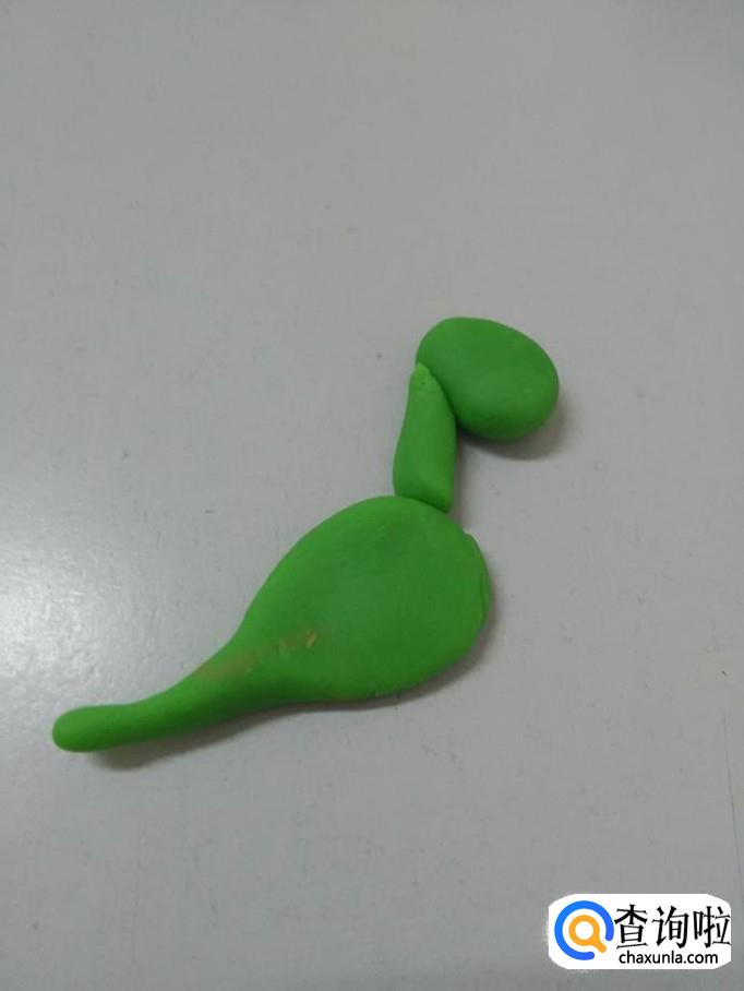 再用绿色捏一个球拍的形状,粘在脖子下面,当作恐龙的身体和尾巴。