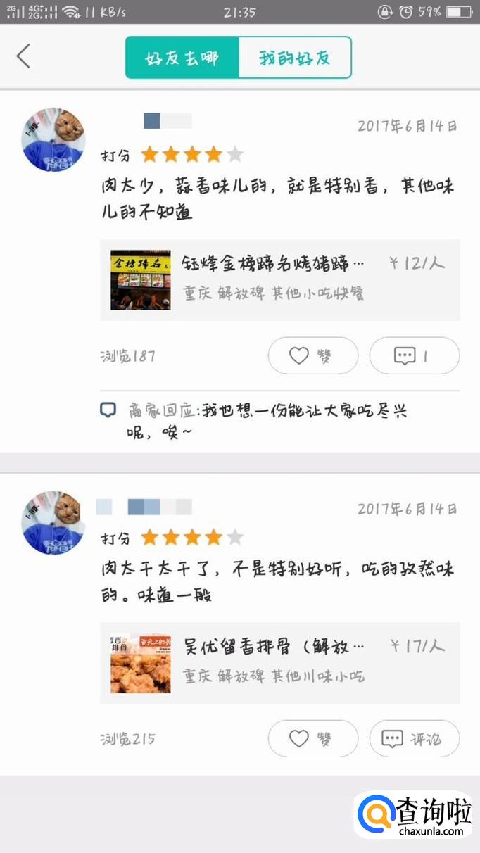 在好友的主页会有他对曾经所购买过的商品的评价,可以点击查看。“好友去哪儿”其实是通过互相查看评价来实现资源共享,以便大家购买到最好的商品。