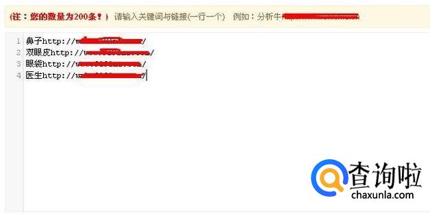 点击“关键词排名查询”后,将会弹出一个新的菜单,在空白处输入你要查询的关键词和网址,左边关键词,右边网址。
