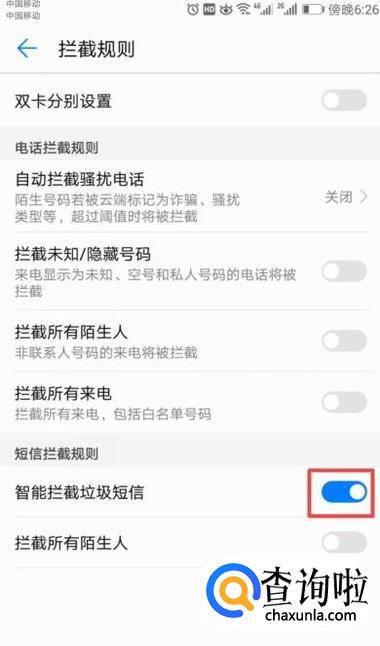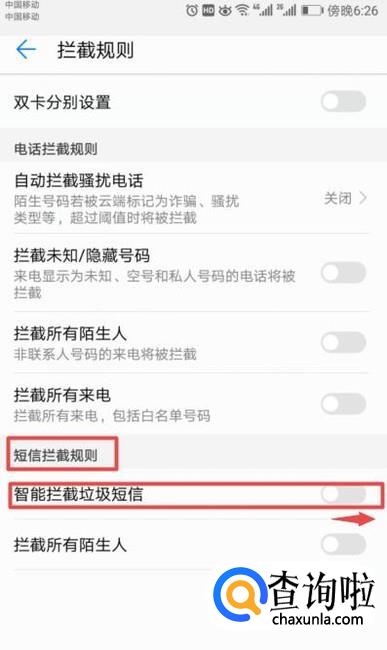 弹出的界面,我们就可以看到短信拦截规则了,我们将智能拦截垃圾短信的开关向右滑动打开,这样就设置好了。
