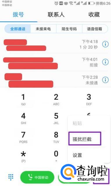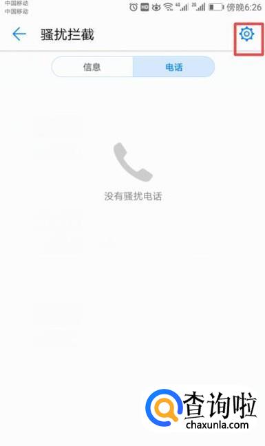 弹出的界面,我们点击右下角的设置,弹出的界面,我们点击骚扰拦截;