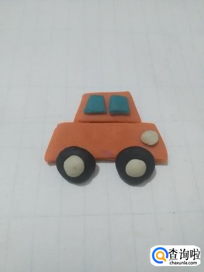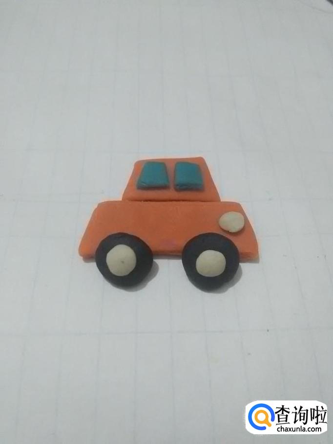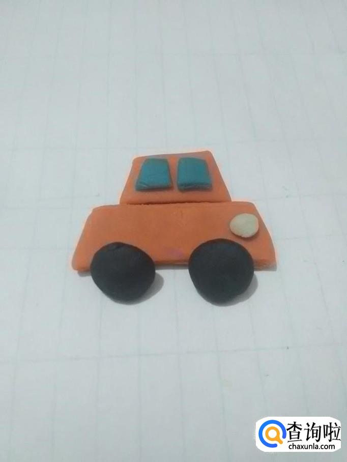 用蓝色彩泥捏两个小的梯形,粘在车顶上,当作车窗。