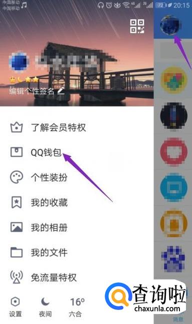 首先,我们进入我们的手机QQ,然后我们点击左上角的头像,弹出的界面,我们点击QQ钱包;