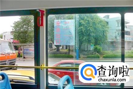 安全锤认识了,现在要认识一下一旦发生意外,用安全锤砸哪个位置的玻璃。并不是所有的车玻璃都可以用安全锤砸破的,你注意观察一下,公交车上的车玻璃有一个位置,斜着紧急逃生安全锤使用位置。