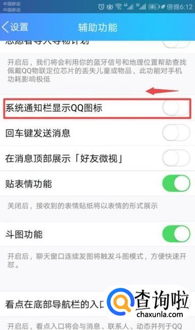 弹出的界面,我们将在系统通知栏显示QQ图标的开关向左滑动关闭,这样我们就设置好了。