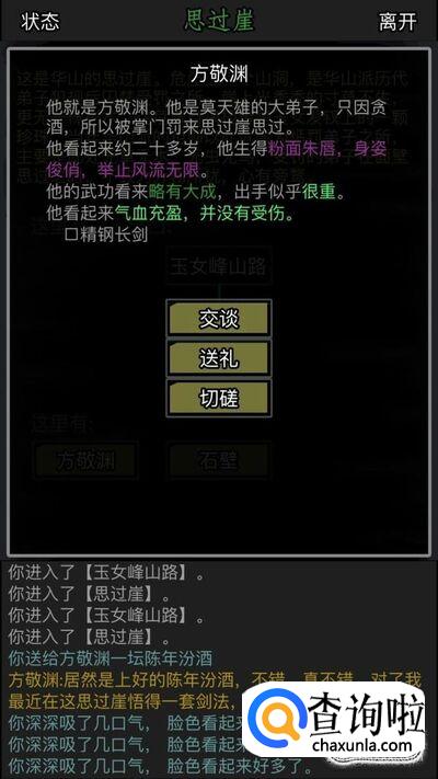 然后我们就走到了思过崖,这时候看到了方敬渊,把酒送给他。