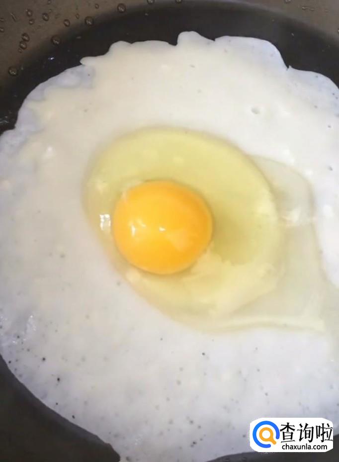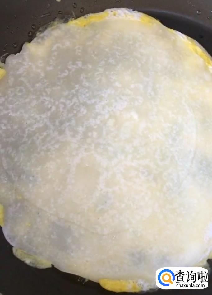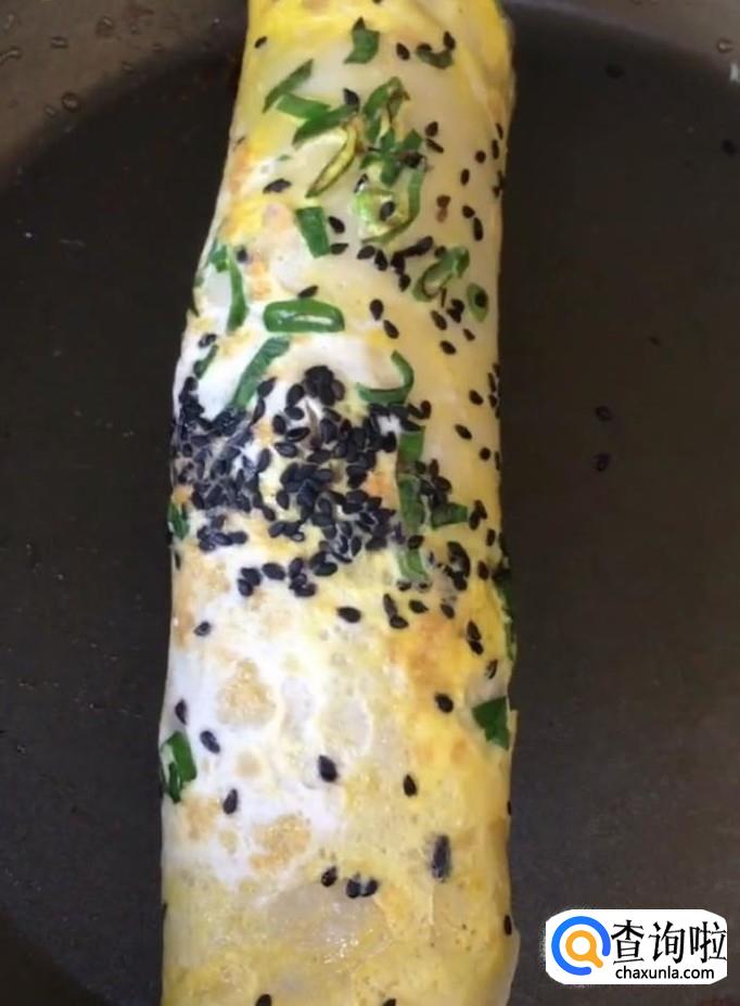 煎至定型以后打入一个鸡蛋,用筷子把鸡蛋摊平,撒一点葱花,黑芝麻
