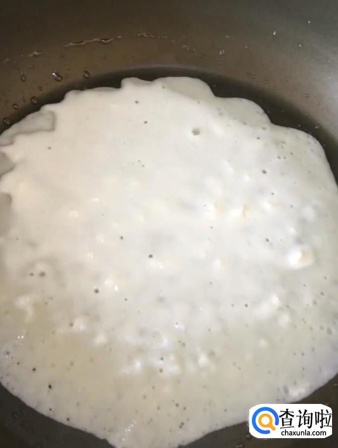 然后我们在平底锅中刷一层油,倒入调好的面糊,小火慢煎
