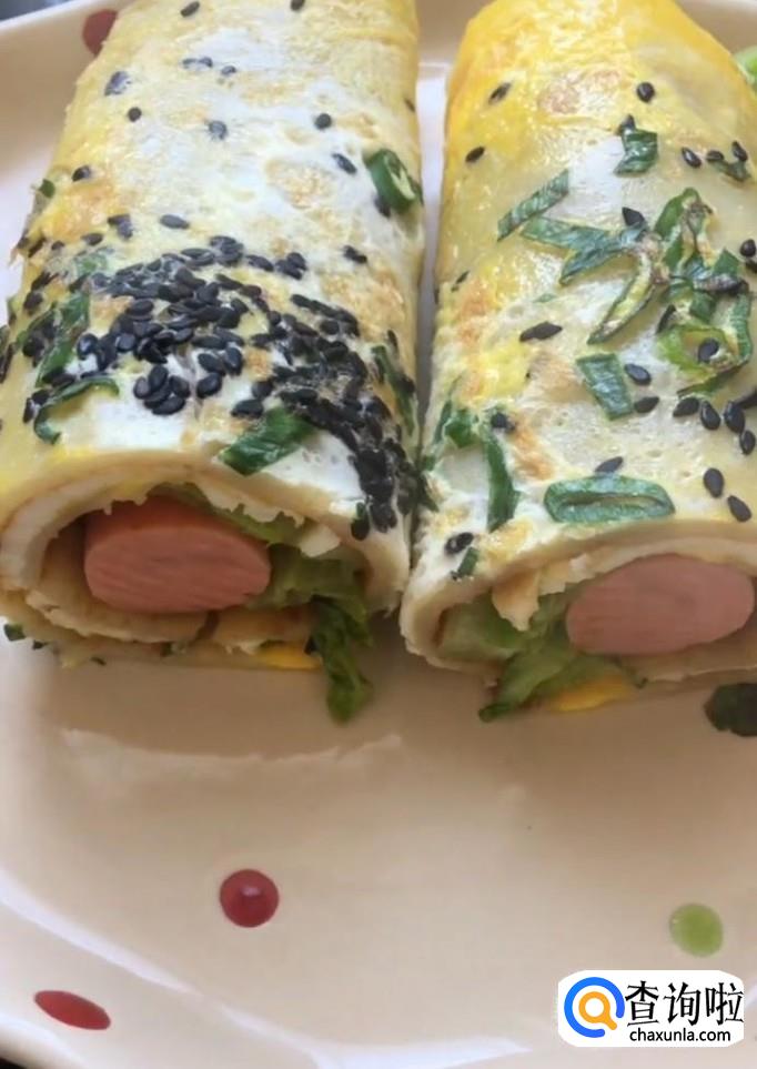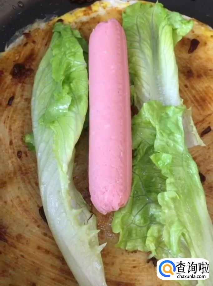 接着我们将饼翻过来,再煎一下,刷上自己爱吃的酱,放上生菜,再放上火腿,卷起来