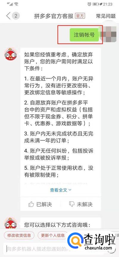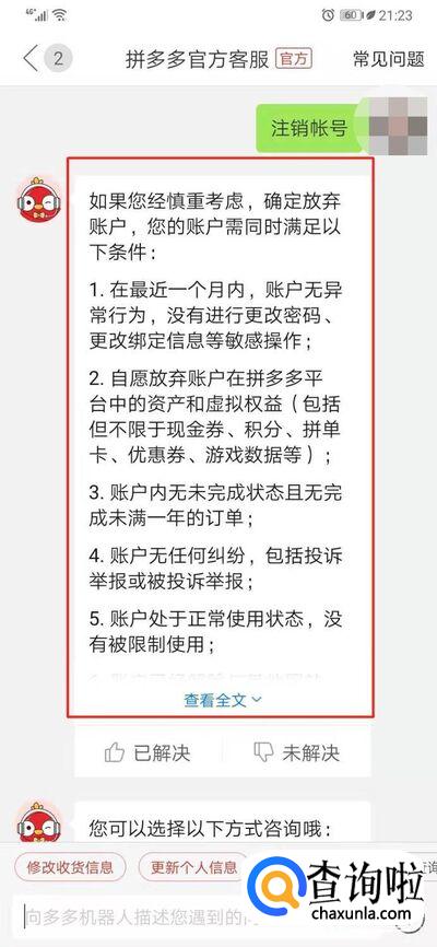 点击后,页面会自动发送注销账号的条件,可以自行查看。拼多多注销账号条件很多,需要符合六个条件才可以注销,比如:注销账号必须近一个月内没有不良使用记录,比如不能更换密码,不能更改绑定信息;注销账号后优惠券等物品也会被清空;账户没有被限制使用;账户已经和第三方网站解绑等等。