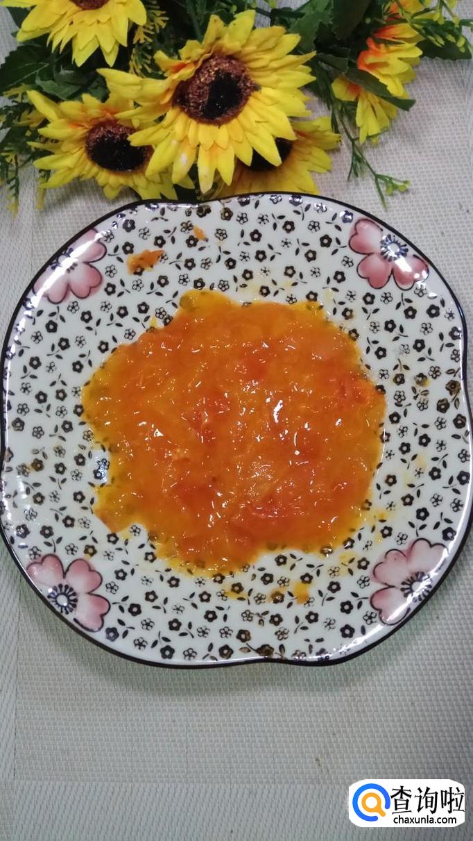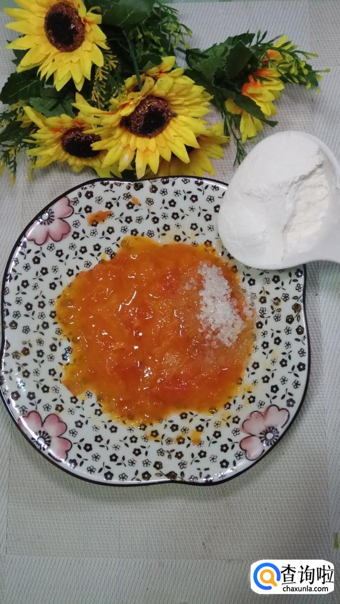 然后将柿子放盘中,用勺子压成泥,放入一勺白砂糖,柿子本身自带甜味,因为还要加面粉,所以加少许白砂糖可以增加丸子的甜味。