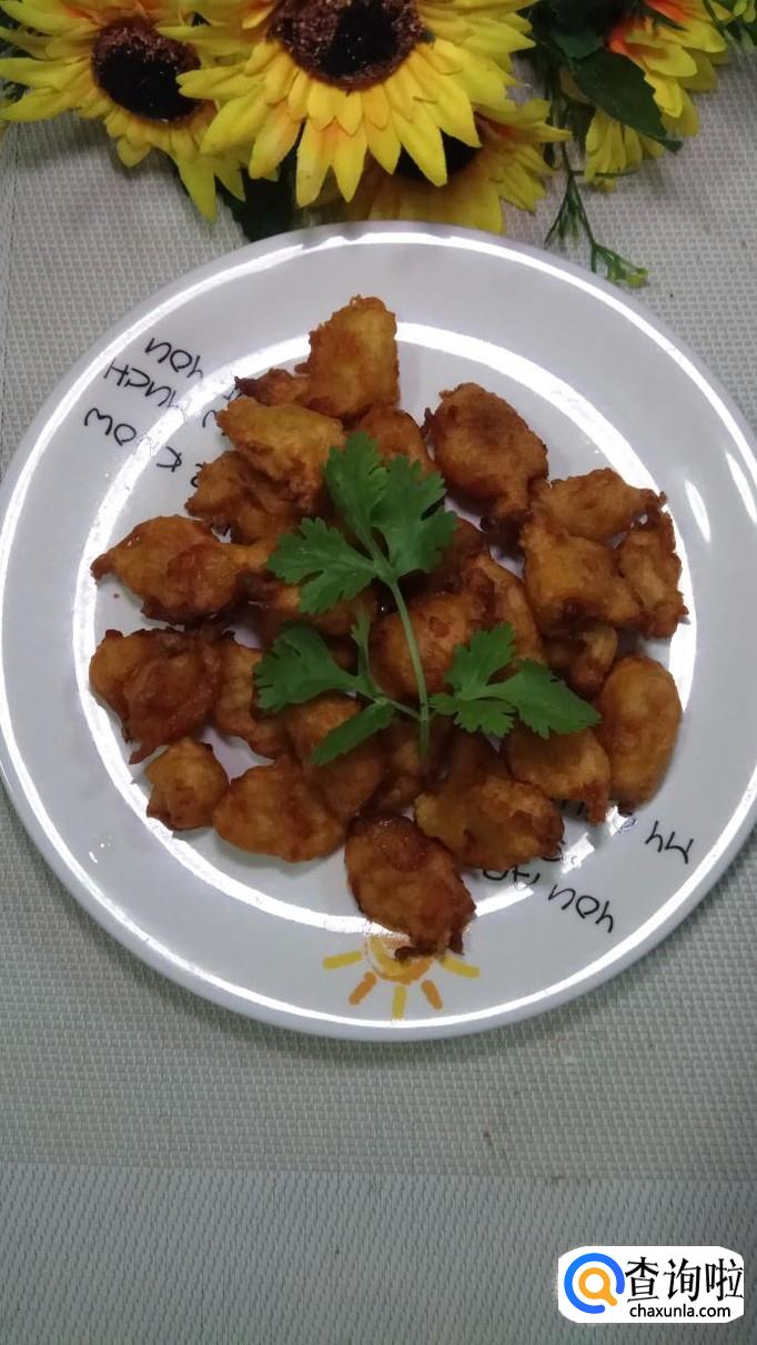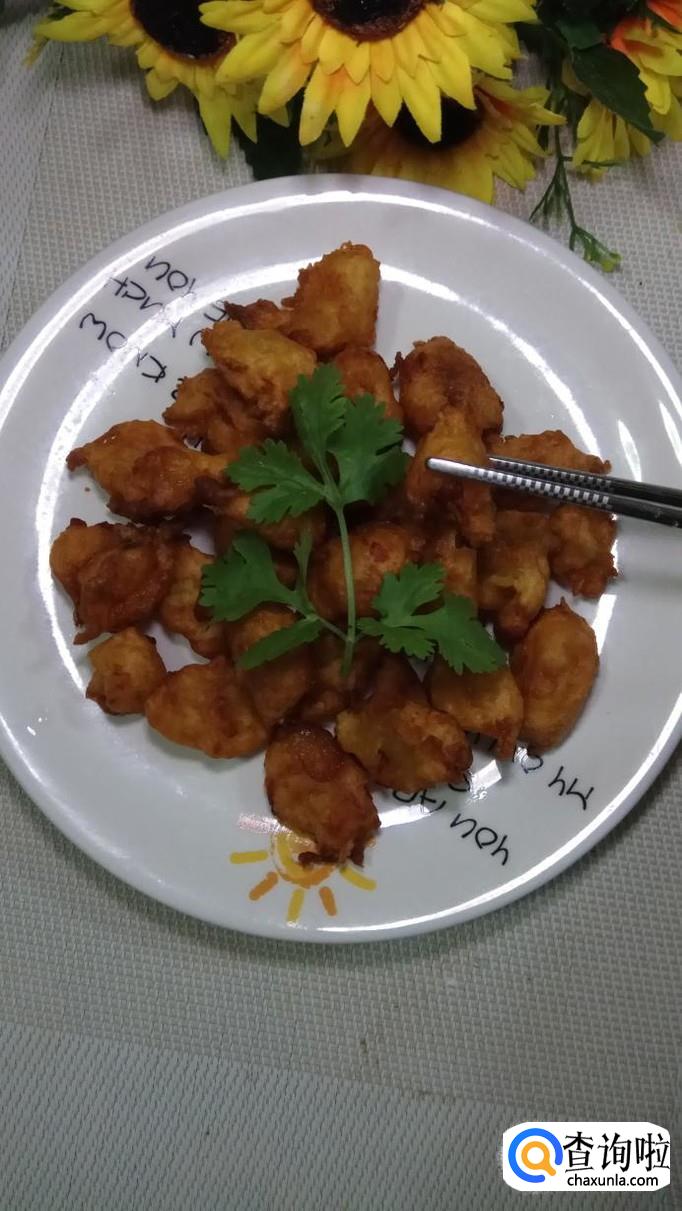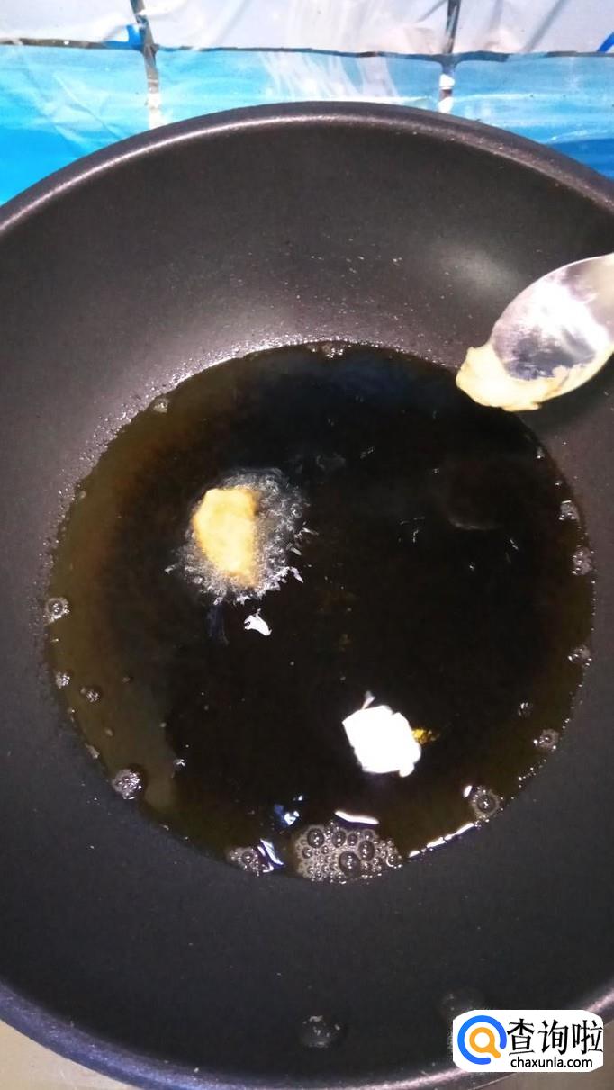 用笊篱捞出沥油,放入盘中。柿子丸子炸熟之后,要及时捞出沥油。