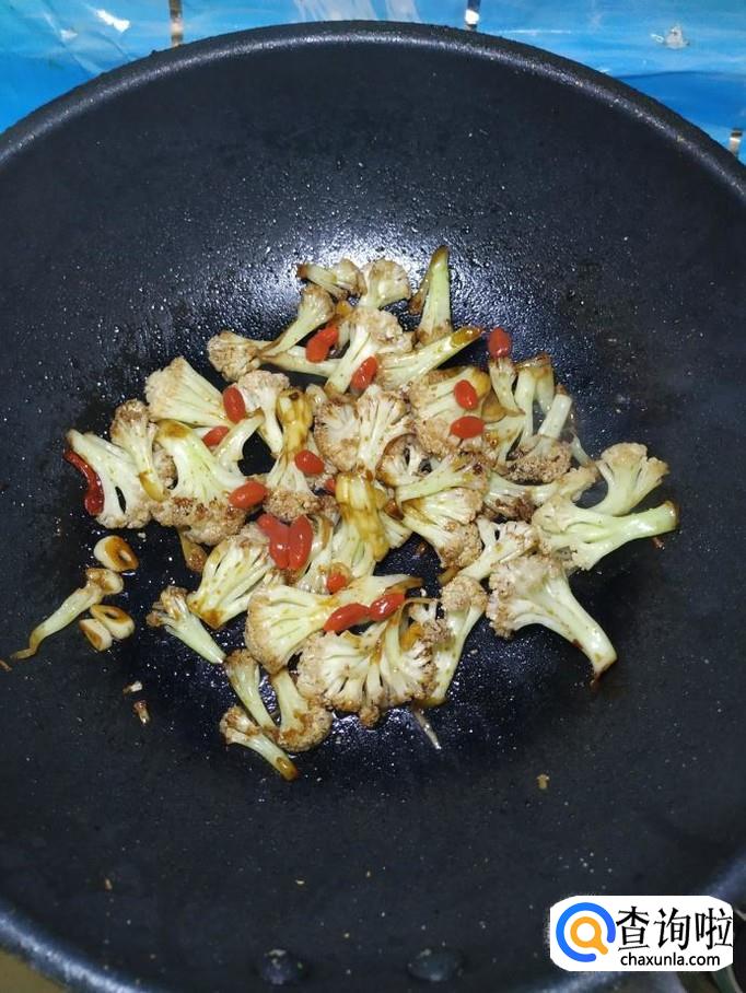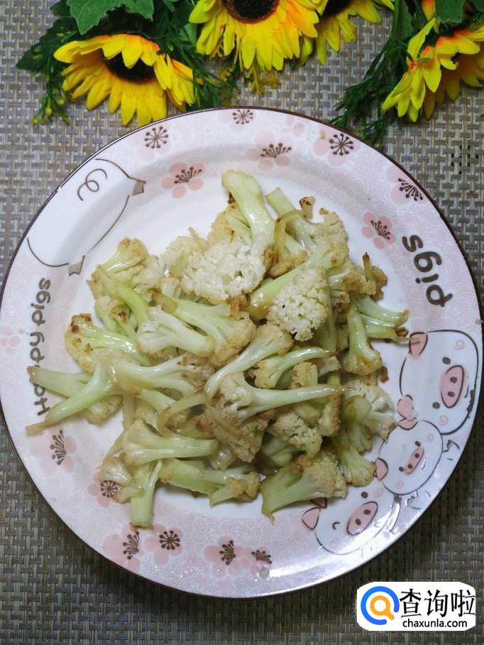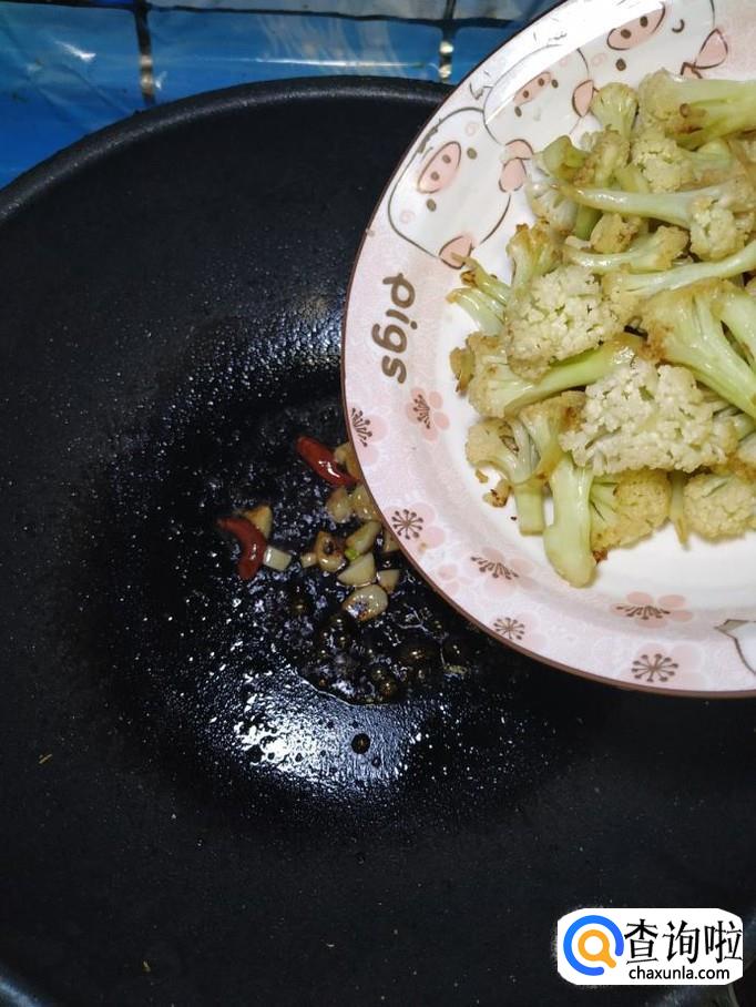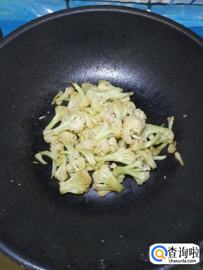 炒锅中放入少许油,将菜花倒入锅中翻炒,可以加入适量食盐,炒至菜花变软,盛出备用。注意,一定要小火煸炒。