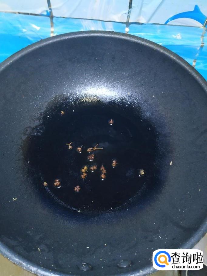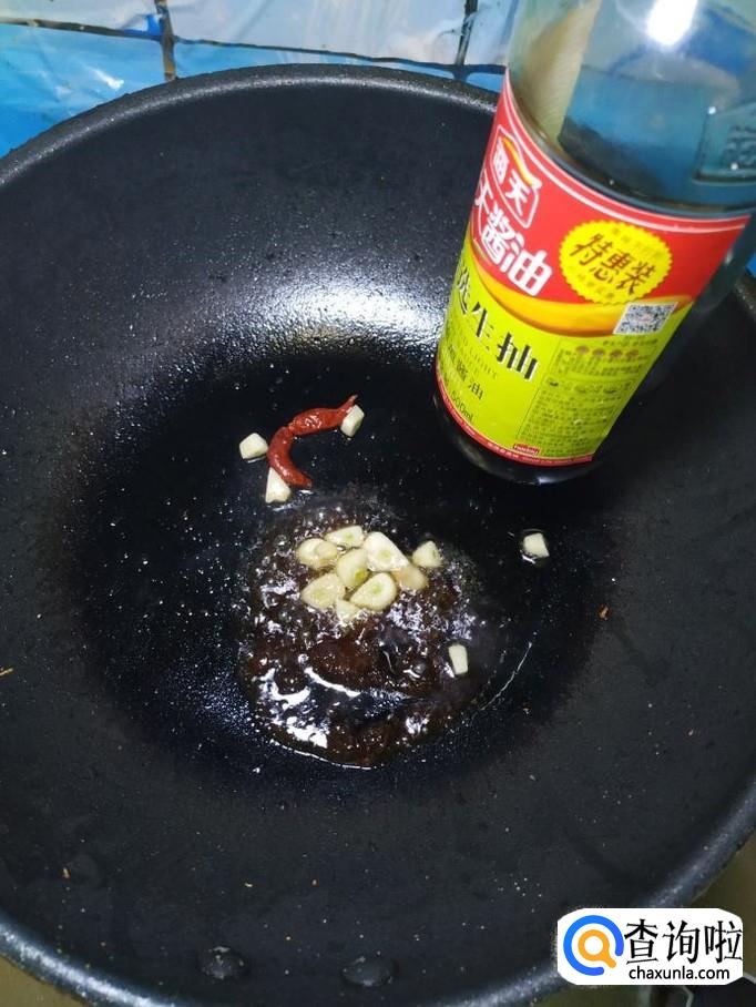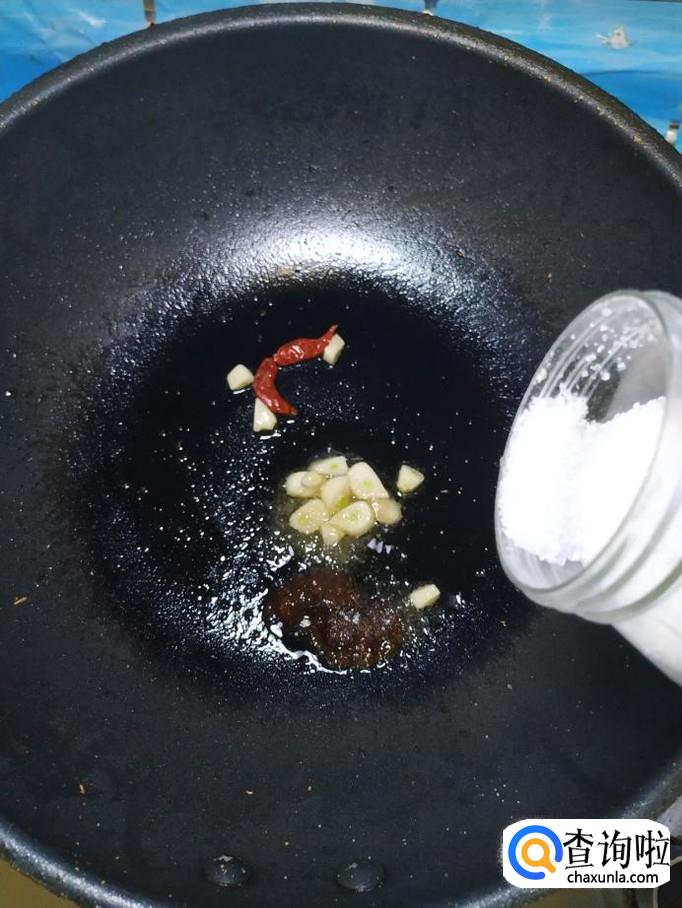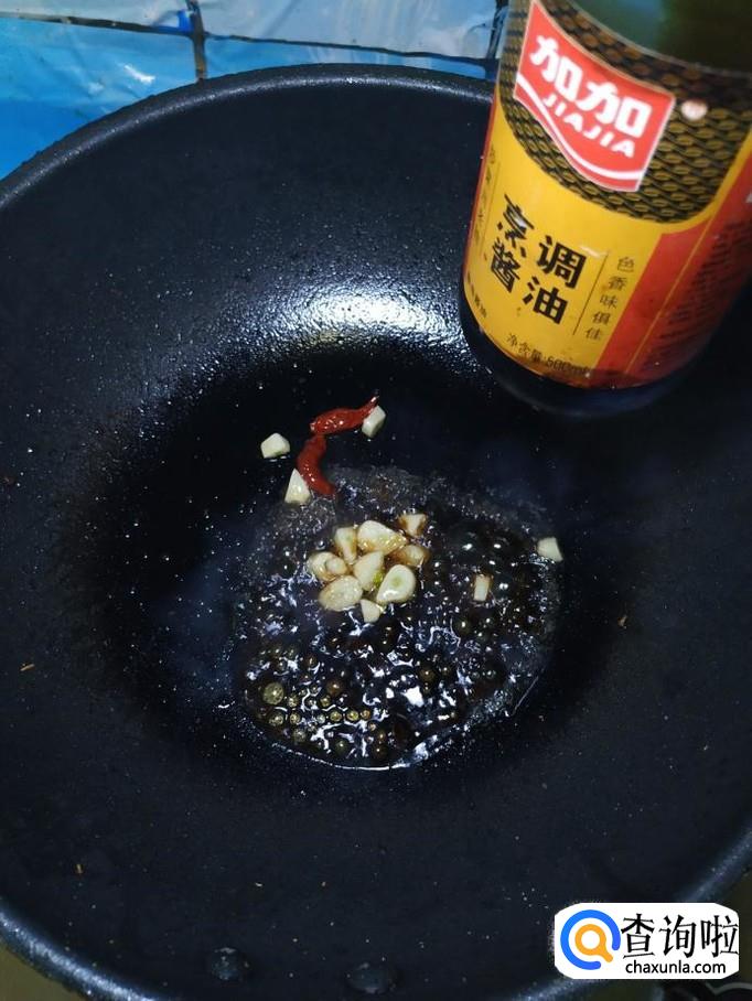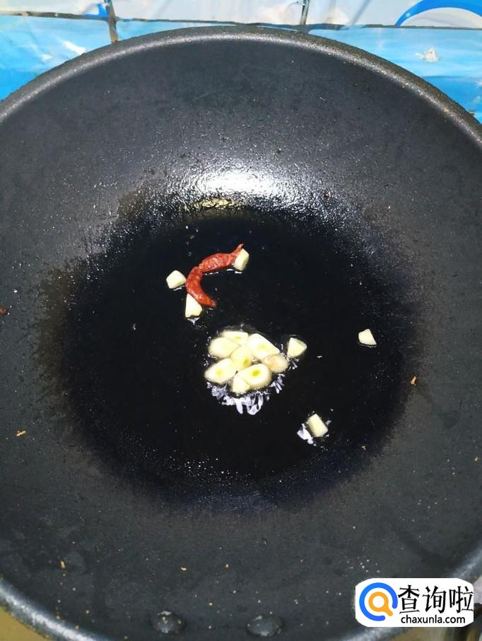 炒锅中放入适量油,油热后将花椒放入锅中炒香,然后将花椒弃之,再加入适量蒜片和干辣椒,炒香后,再加入一勺豆瓣酱。