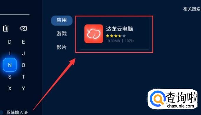 打开电视,在电视盒子中自带的应用商店搜索“达龙云电脑”,将其安装在电脑上面。