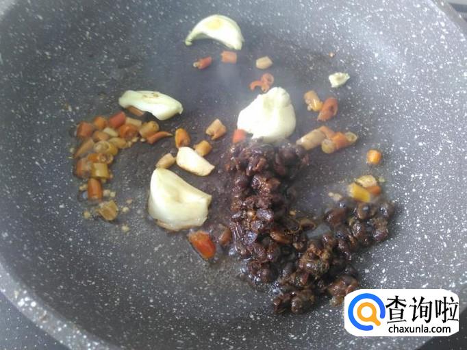 放蒜米、豆酱、小米辣进去爆香。