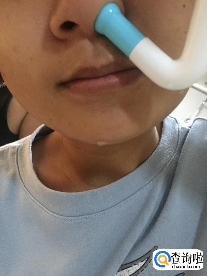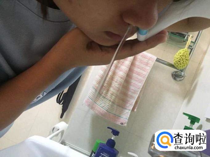 用品准备完毕就可以操作了,将洗鼻器倒立,喷头插入一侧鼻孔中,头稍偏向另一侧。