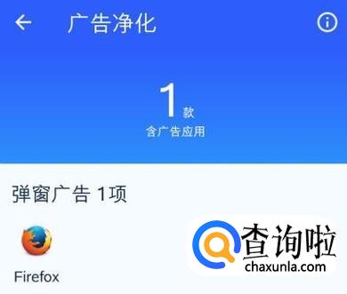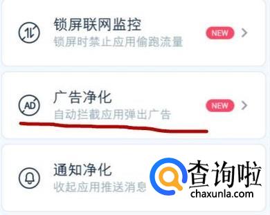 这款APP有拦截广告,通知净化和清理垃圾的作用,打开后找到广告净化。点击进入广告净化。