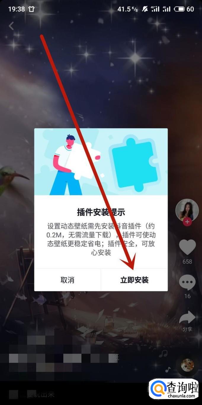 首次用抖音设置壁纸需要安装插件,点击“立即安装”,如图所示。
