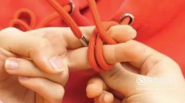 再用剩下的带子先从右边的食指和中指中间穿过,从左边穿下去,成一个横着的圈,再从后面的右边穿出刚才的圈。