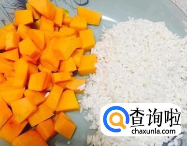 将南瓜去皮,切成薄片儿,再准备淘好的大米。