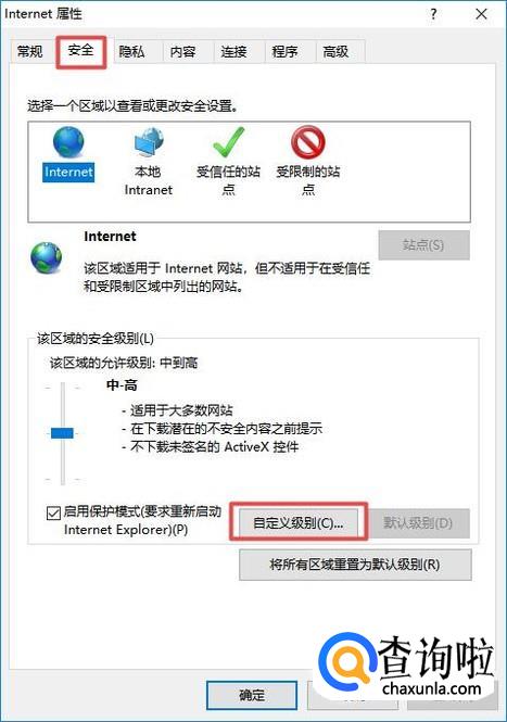弹出的界面,我们点击安全,然后我们点击自定义级别;