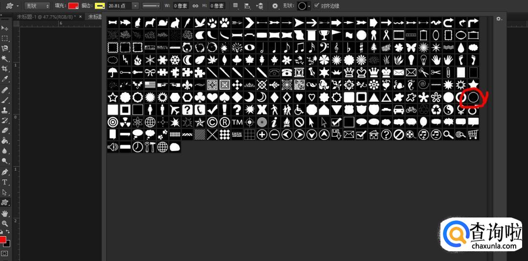 先画圆环。建议使用形状工具画圆环,这样画出来的圆环是矢量图,更实用。如下图所示使用形状工具。