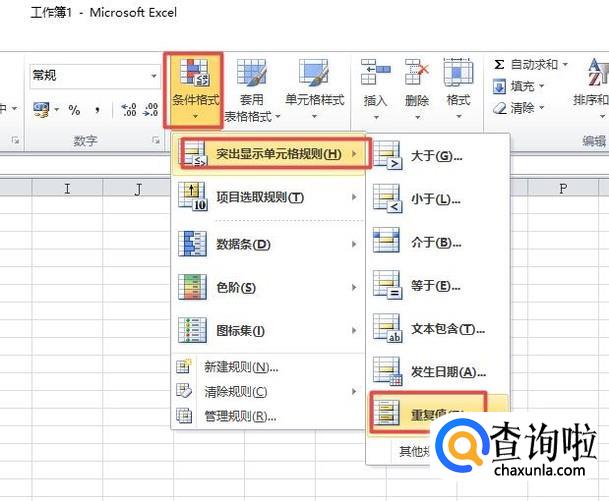 然后我们点击条件格式,之后我们点击突出显示单元格格式,然后我们点击重复值;