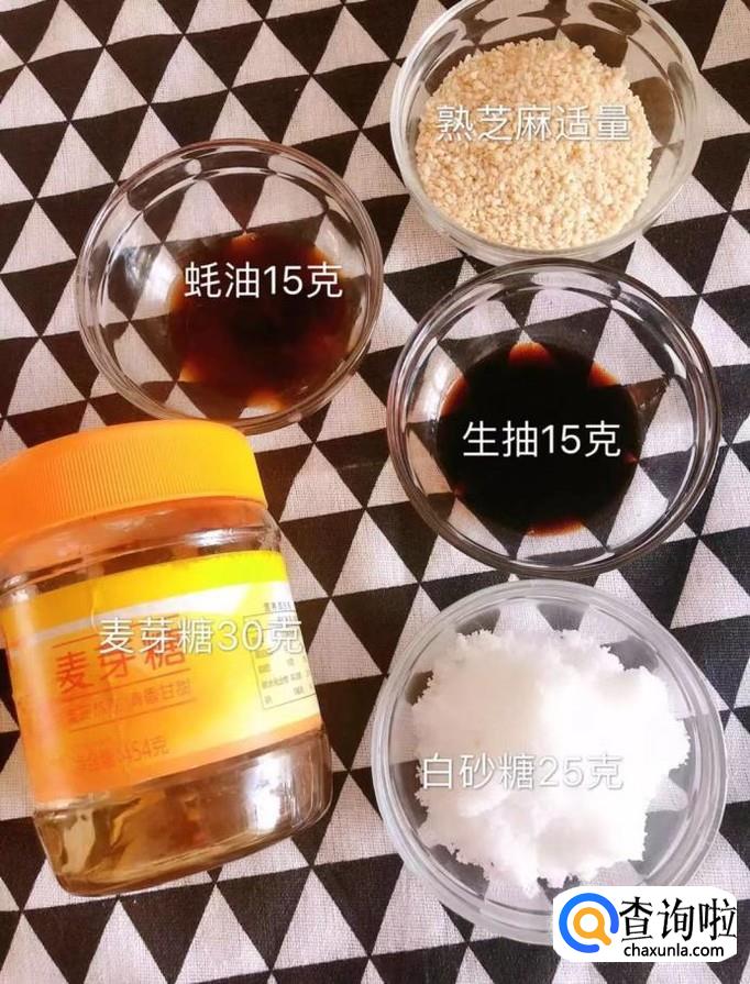 食材:蚝油15克,麦芽糖30克,生抽15克,白砂糖25克,熟芝麻适量。
