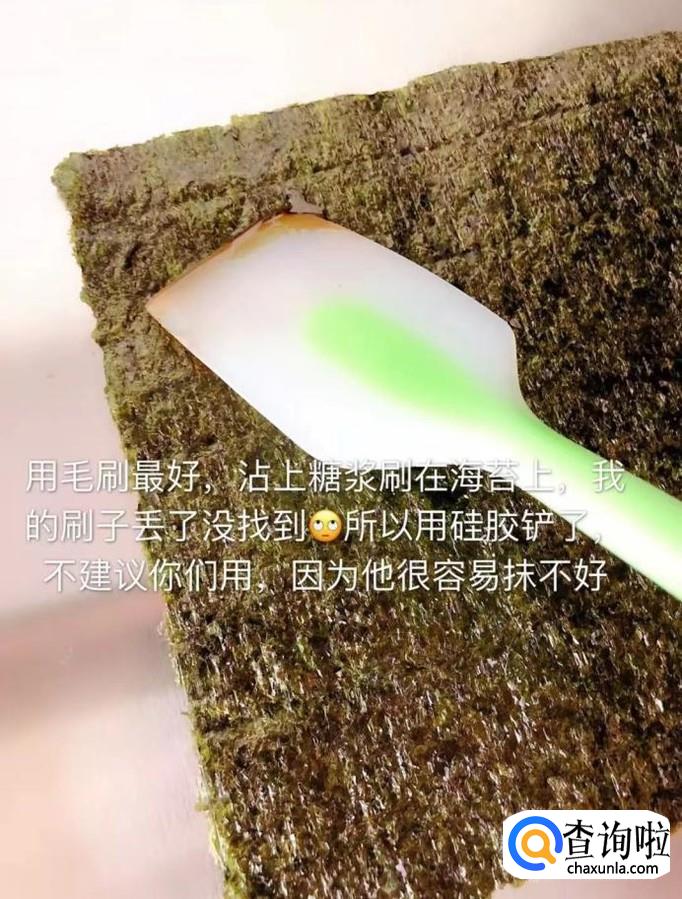 接着取一片的海苔粗糙面朝上,用刷子涂抹上酱料,如下图所示。