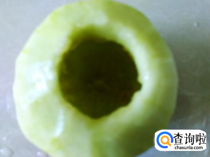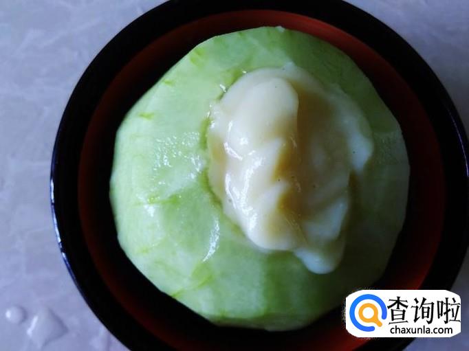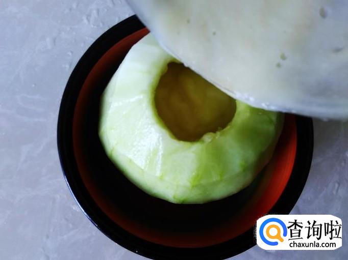 然后把绿豆沙倒到香瓜里面。