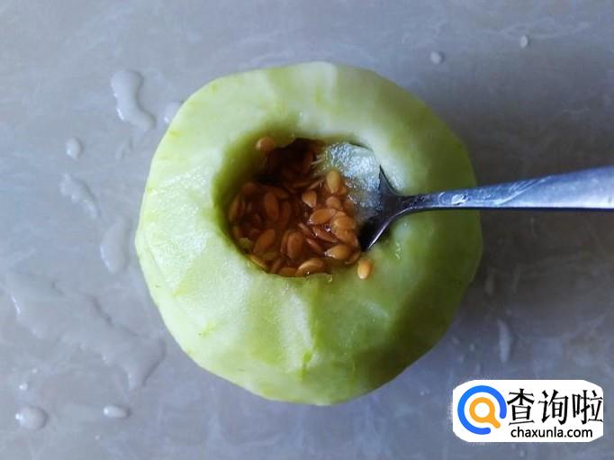 然后在香瓜顶端挖一个洞,用小勺子把里面的籽挖出来干净。