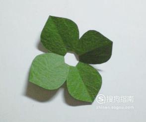 剪一张绿色正方形纸,斜线对折3次,然后在有三条边的一边剪一个弧形,最中心点剪出一个洞,并展开,变成花托,粘在做好的花下。