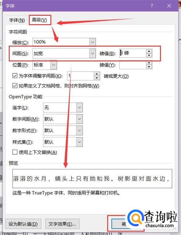 在“字体”对话框中“高级”选项卡下,把“间距”调整到“加宽”,“磅值”输入“3磅”,然后点击确认。